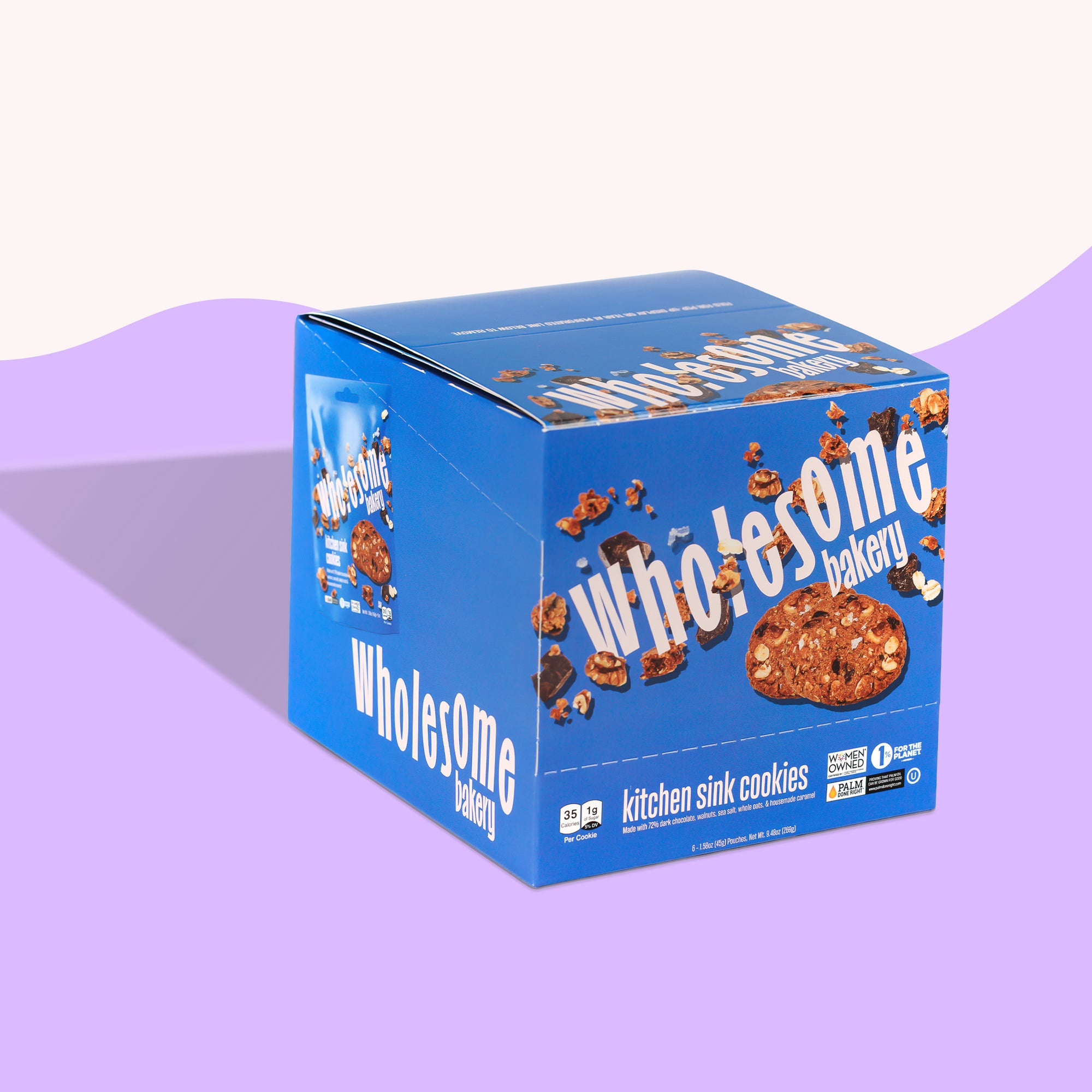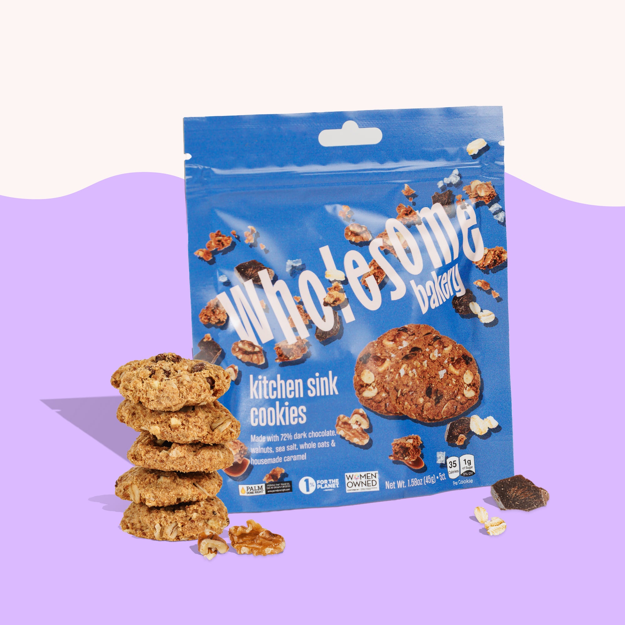 Our best-selling cookie now in the perfect grab-and-go size! Our Kitchen Sink Cookies are loaded with 72% dark chocolate chips, rolled oats, house made caramel, crunchy walnuts.