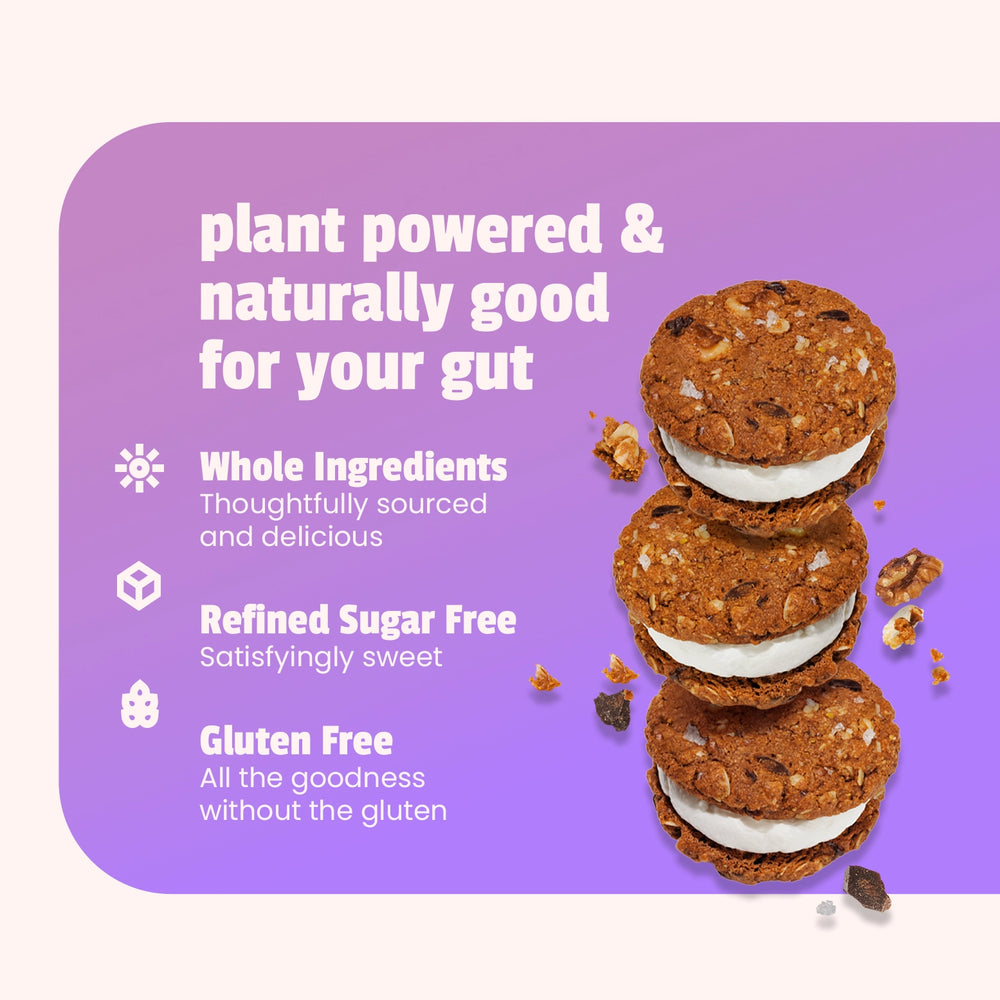 We threw everything but the kitchen sink at these babies. Rich vanilla butter cream sandwiched between our Kitchen Sandwich Cookies, made with 72% dark chocolate chunks, rolled oats, house made caramel, and crunchy walnuts.