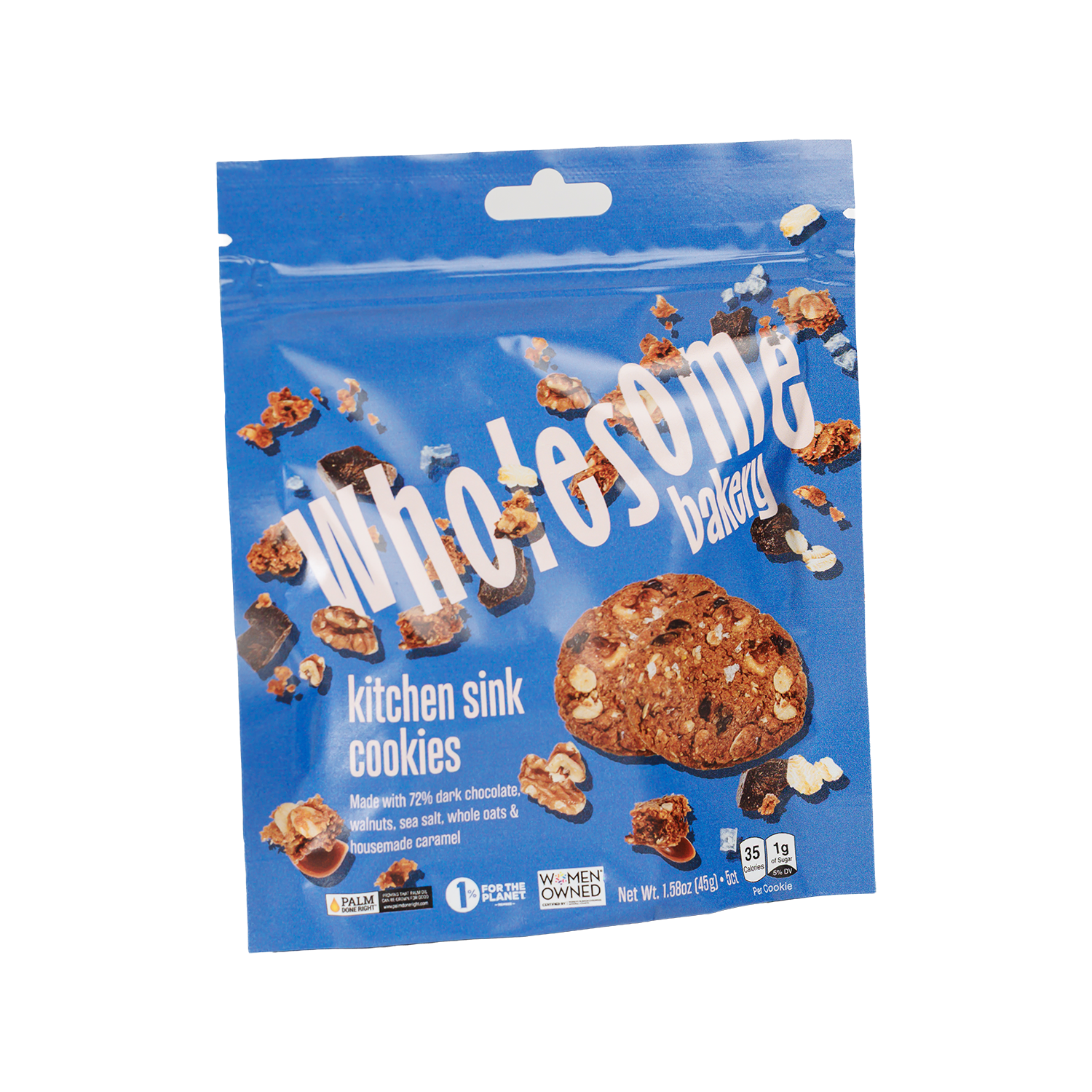 Our best-selling cookie sandwich, now perfectly sized for on-the-go! Loaded with 72% dark chocolate chips, housemade caramel, walnuts, rolled oats, and layered with smooth vanilla buttercream—this deliciously chaotic treat delivers happiness in every bite.
